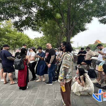 5月29日,中新经纬走访故宫等景点,在神武门出口处每走几步就能见到外国游客的面孔。举着向导旗、戴着扩音器的外语导游说着流利的英语,在人群中尤为显眼。陈旭就是其中之一,这天他带的旅行团游客是各国文身师和文身爱好者,他们5月在河北廊坊参加完展会活动后来北京游玩,大多数是第一次来中国。